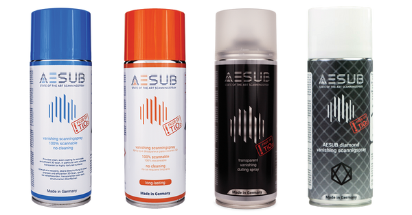 The AESUB brand of 3D scanning sprays offers an ideal coating solution for difficult surfaces, including dark, transparent, and shiny objects, as well as items with deep pockets.